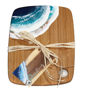 Ocean Boards by Eveline is located in St. Andrews By-the-Sea, New Brunswick. With the Bay of Fundy as an inspiration, ocean waves are recreated using non-toxic resin on a variety of wooden cutting boards. They make unique charcuterie boards.